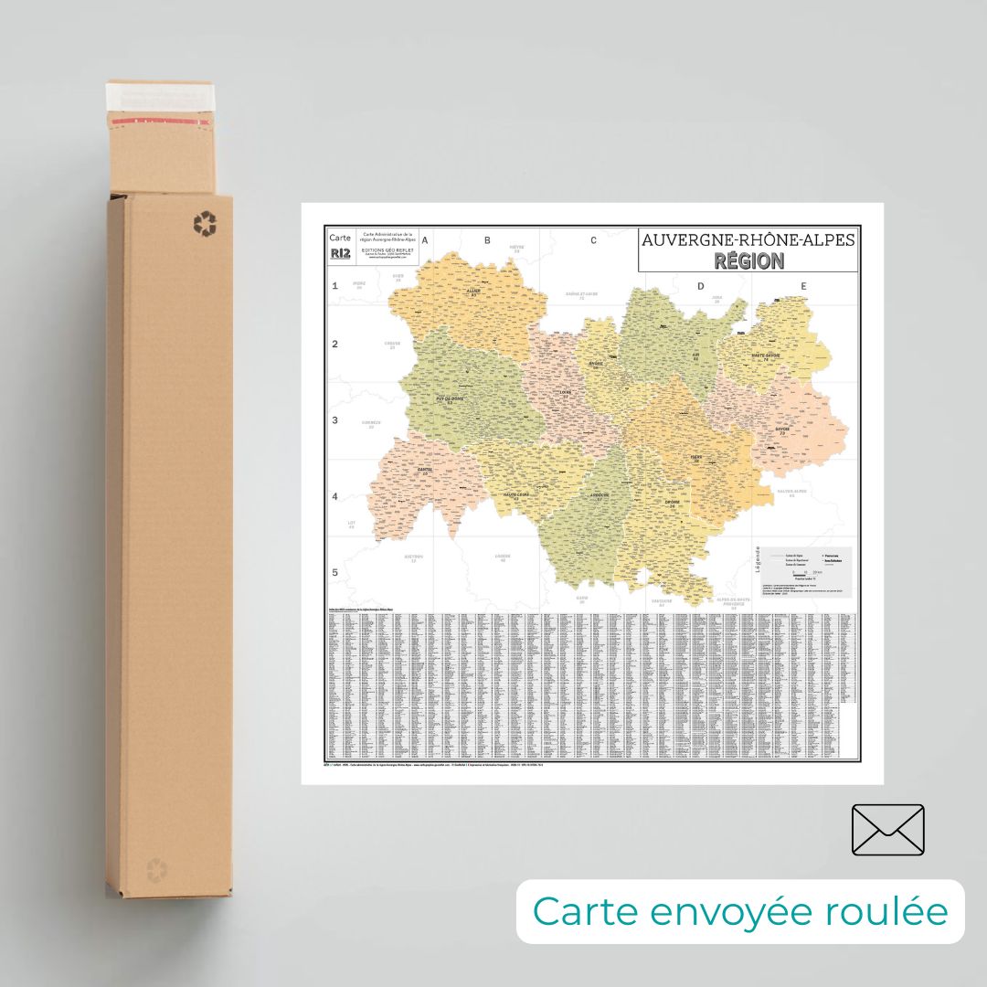 Région Auvergne-Rhône-Alpes avec les départements et toutes les communes au 1er janvier 2025 (données sources : data.gouv.fr). Cette carte à l’ambiance vintage habille facilement vos murs.